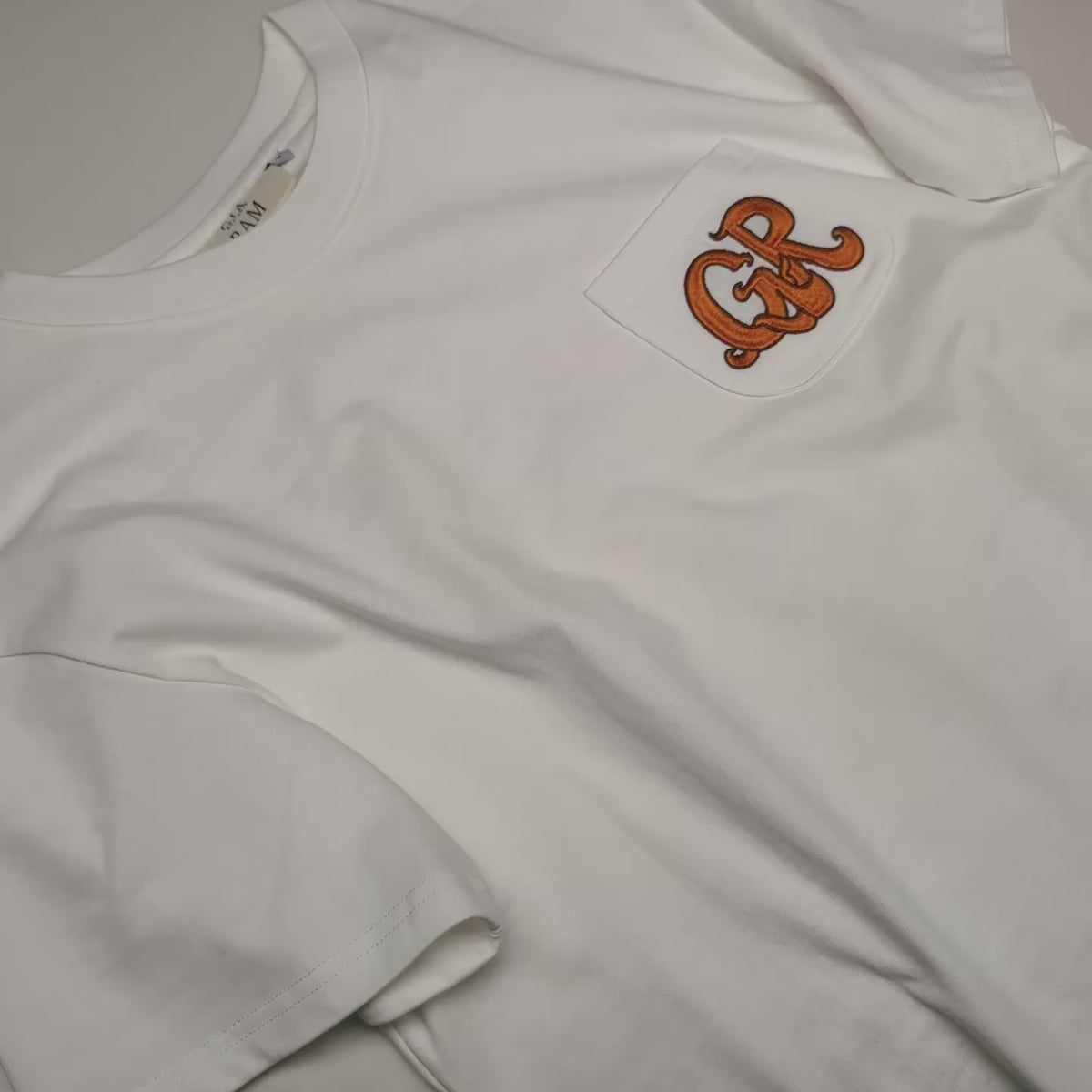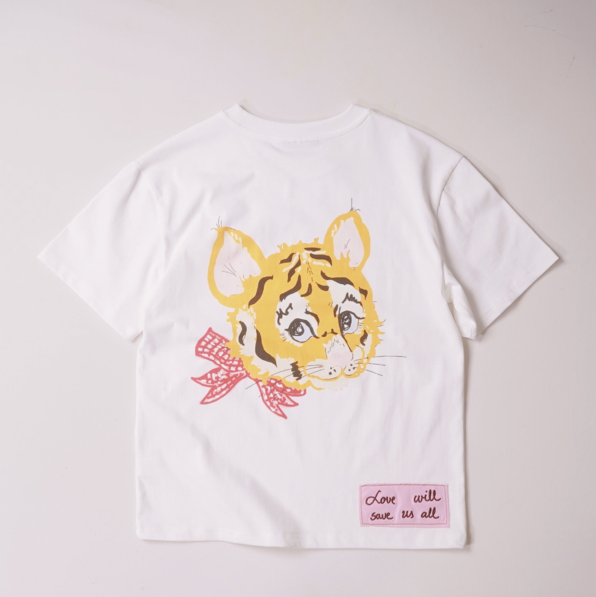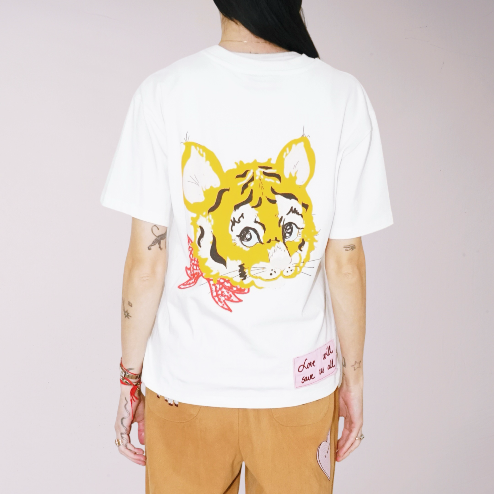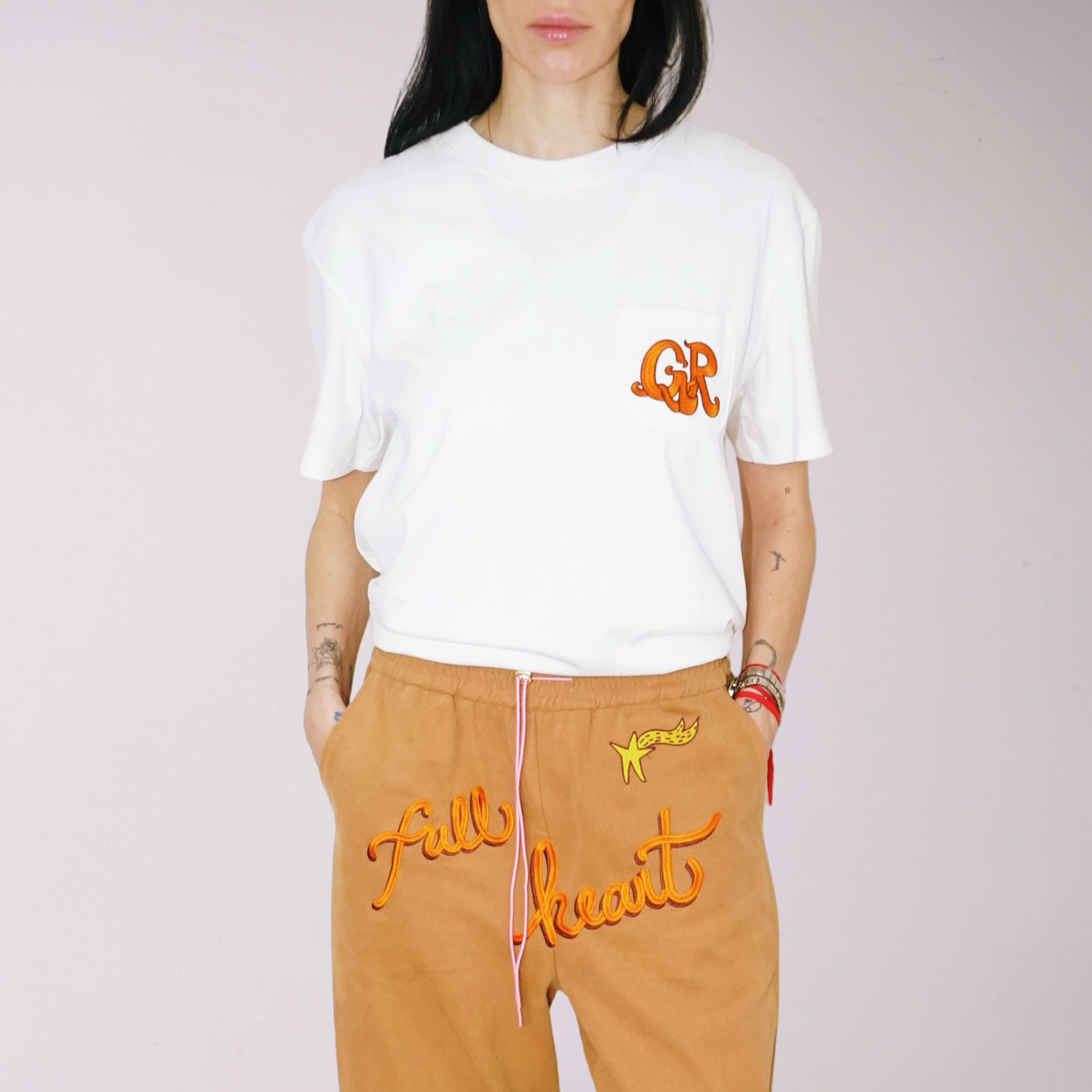 100% heavy weight cotton t-shirt, oversized fit, unisex, white color with embroidery on front pocket, big print on the back and embroidered pink patch, model is 1.78 height & wears size S
