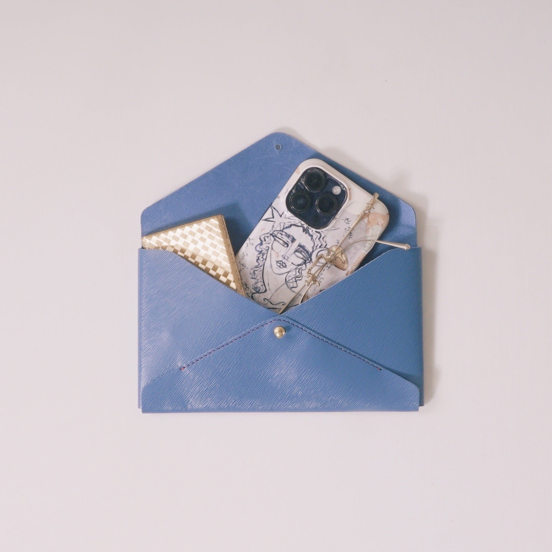 Hand made pouch from leather leftovers. Envelope design, made to fit large phone, passport, lipstick & more.