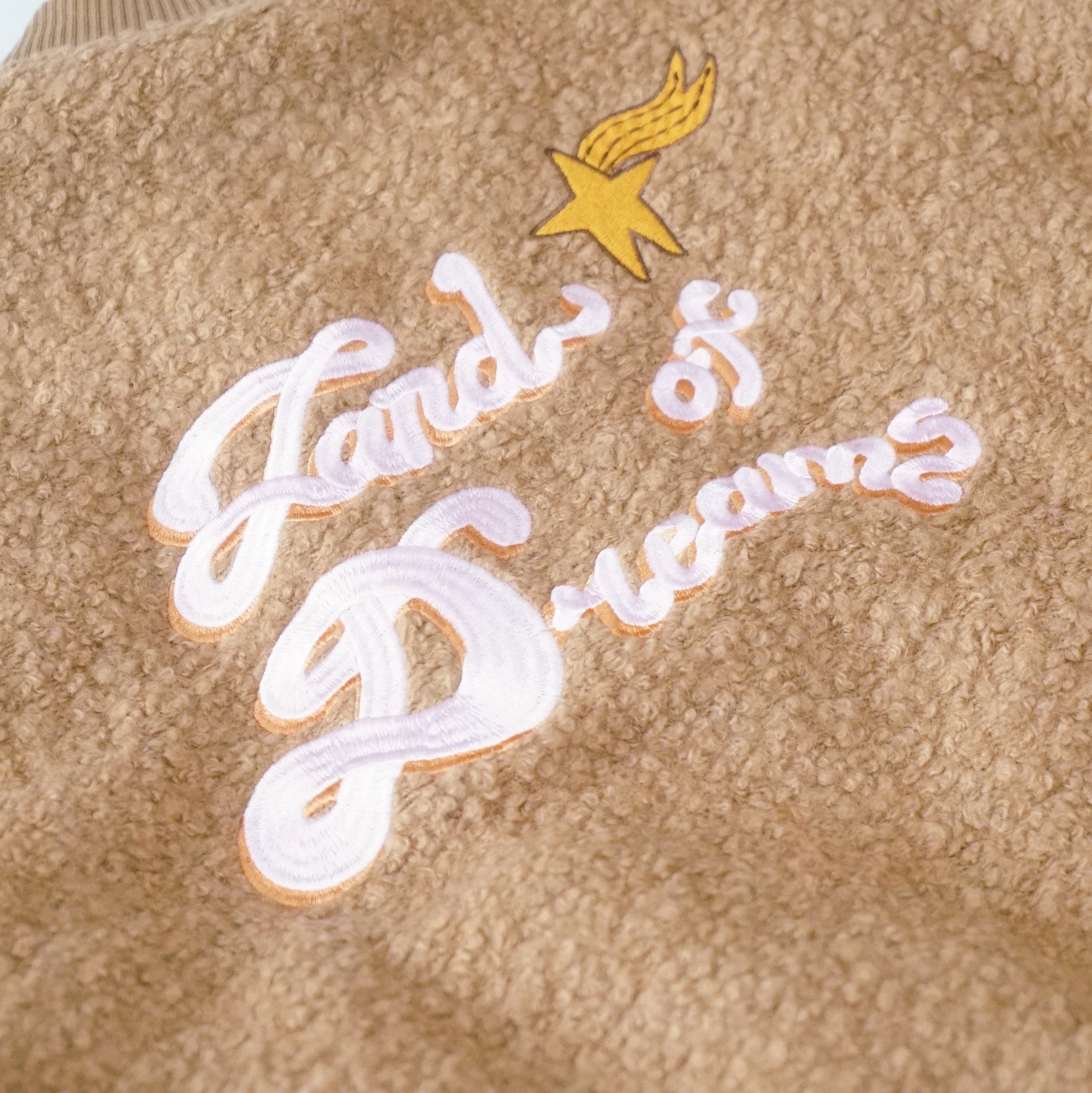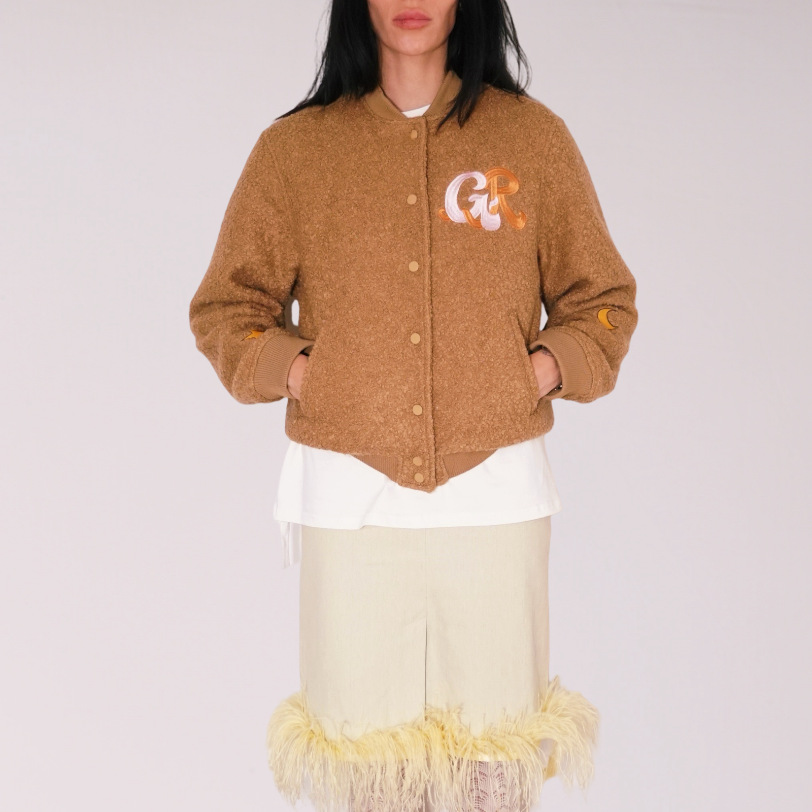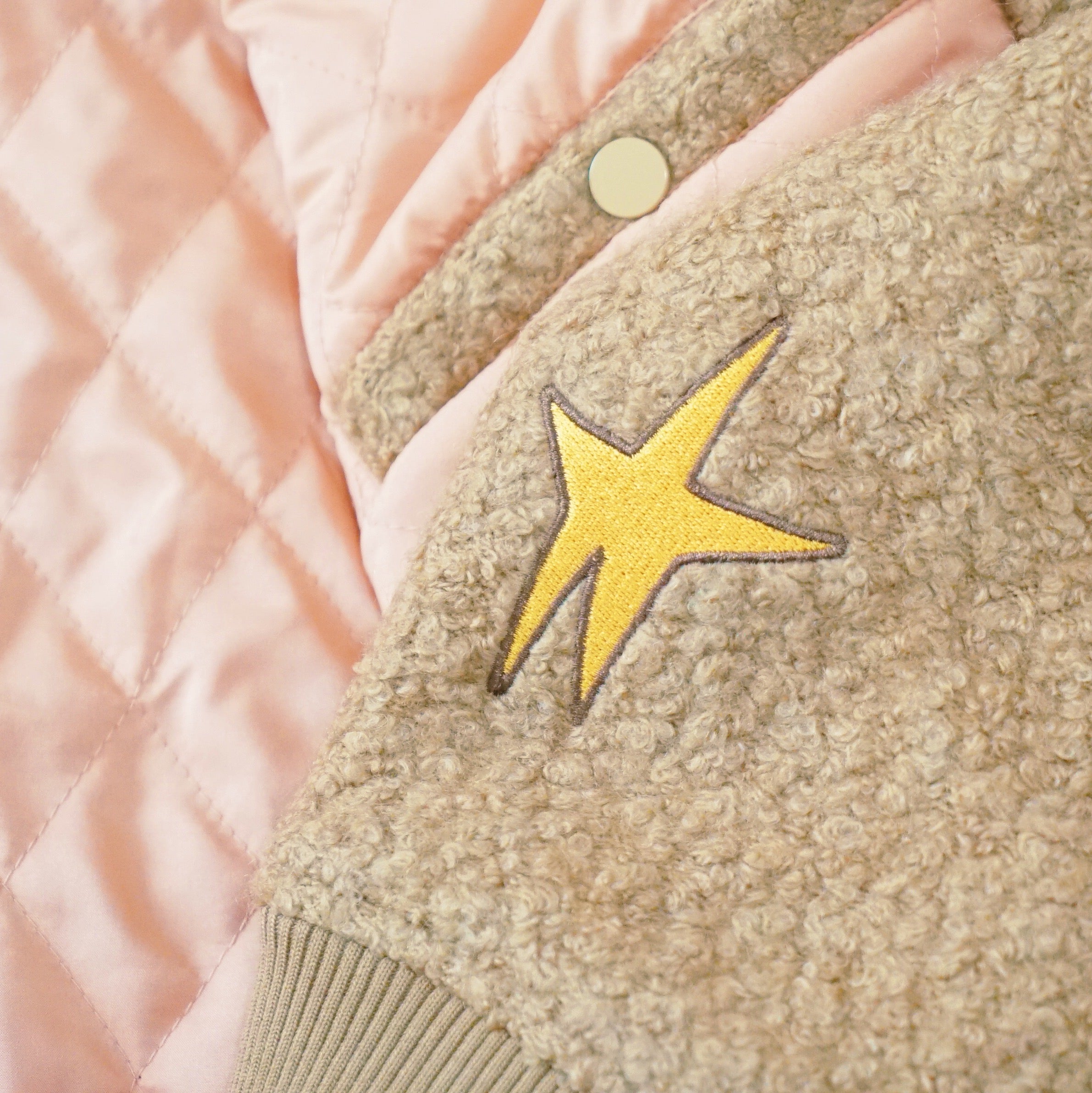 Bomber jacket, loose fit, mix of wool boucle style fabric for extra warmth, 100% cotton pink lining inside, hidden pocket inside