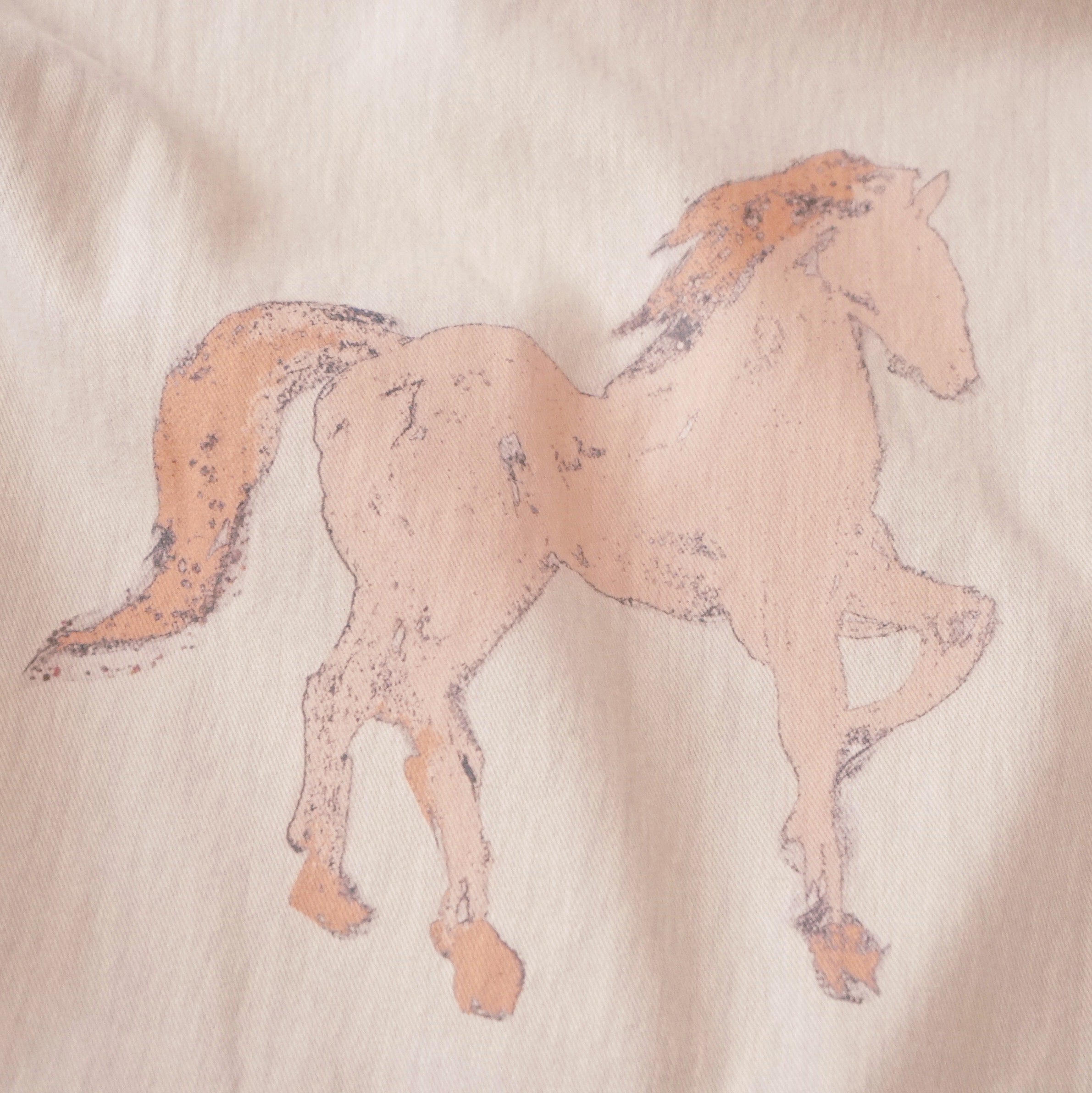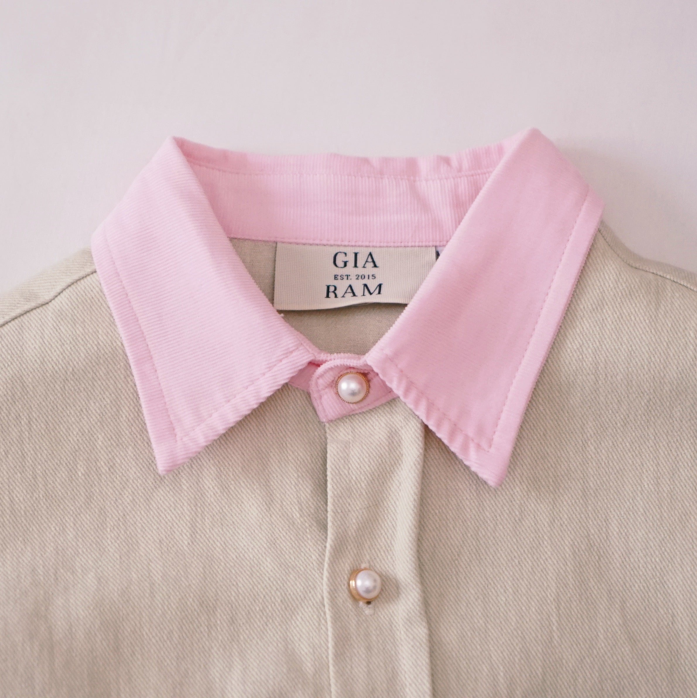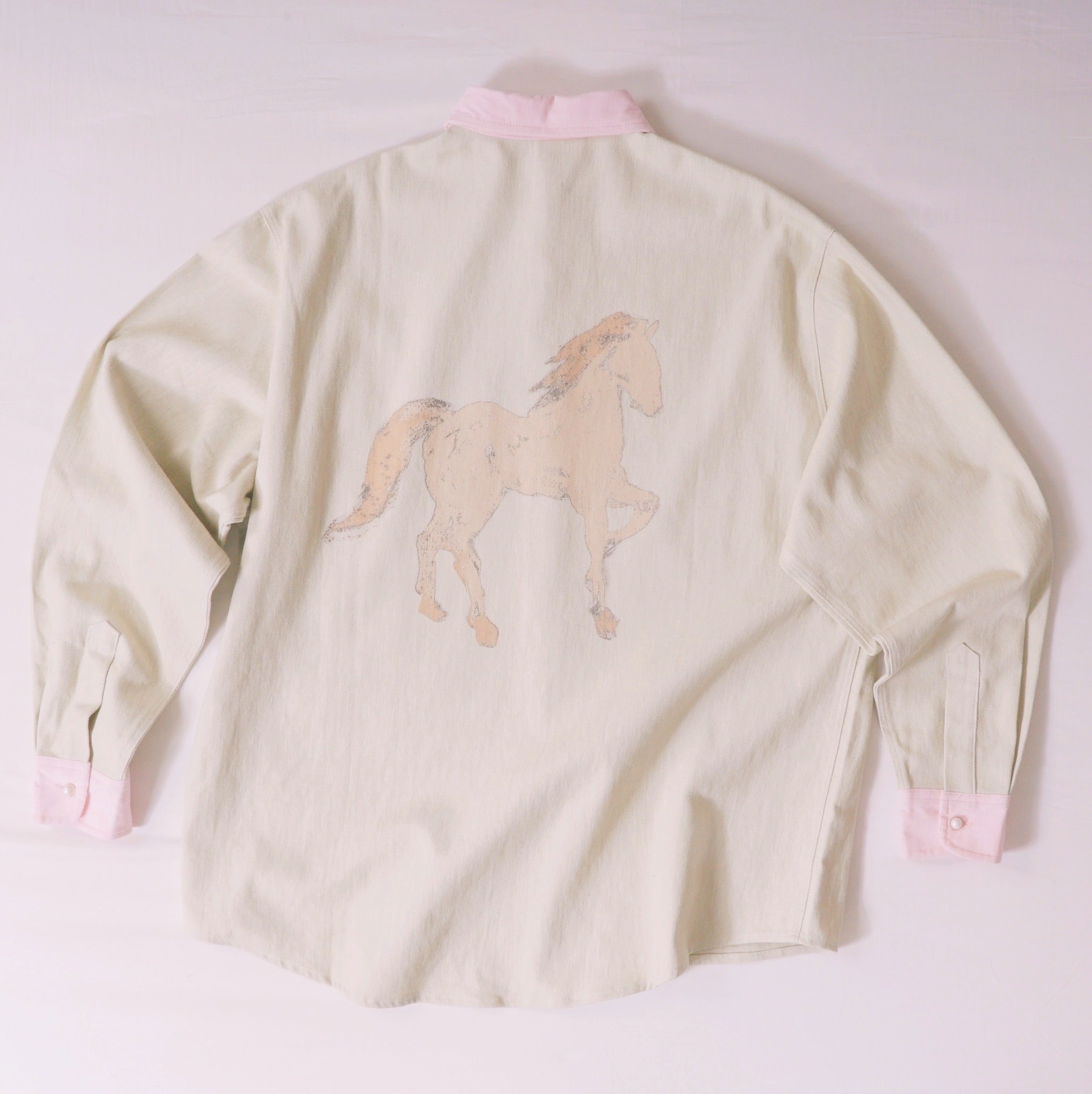 100% thick denim with faux pearl buttons, light green colour, pink corduroy collar, embroidered front pocket, horse print on the back, model is 1.78 height & wears size M