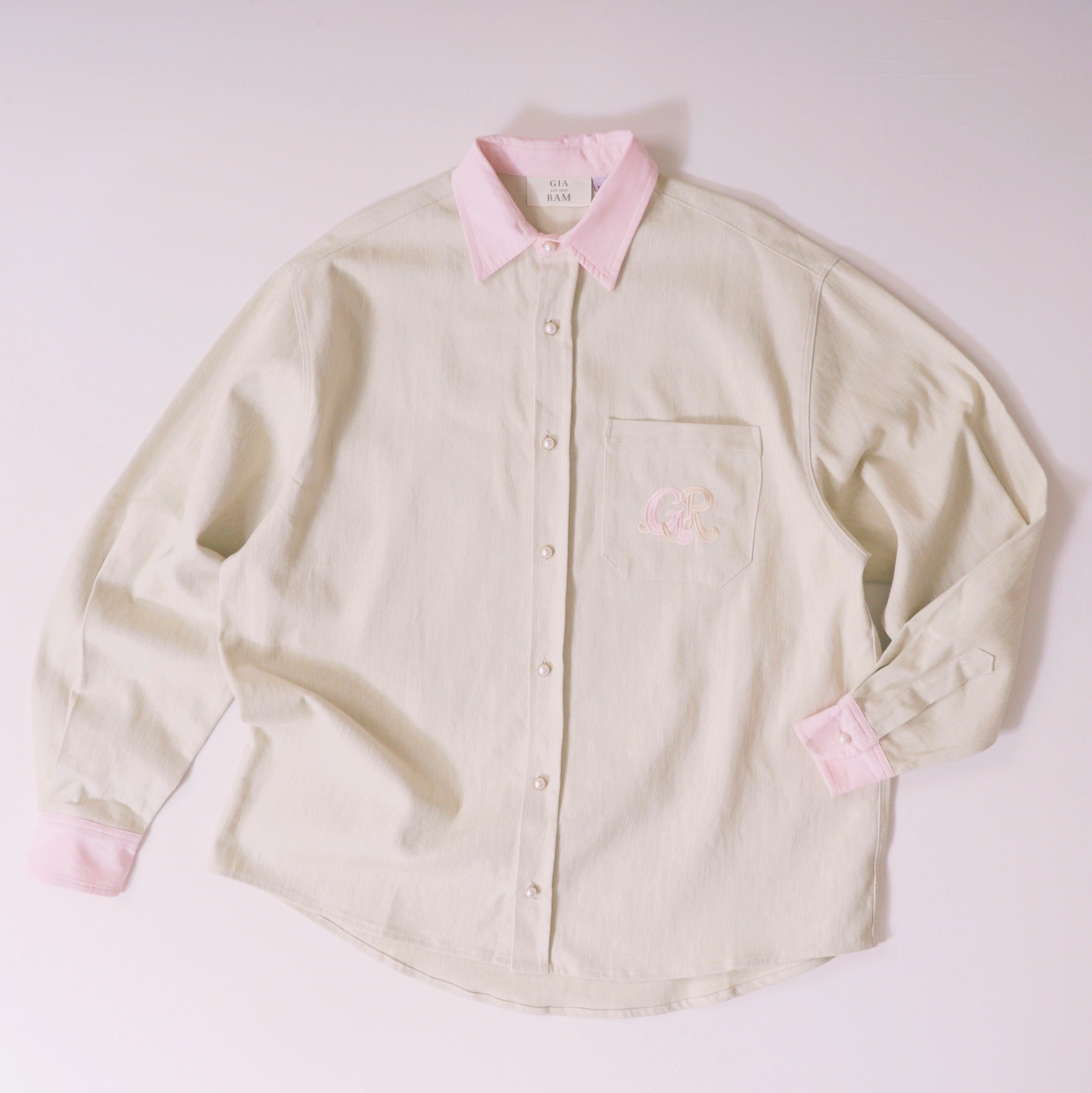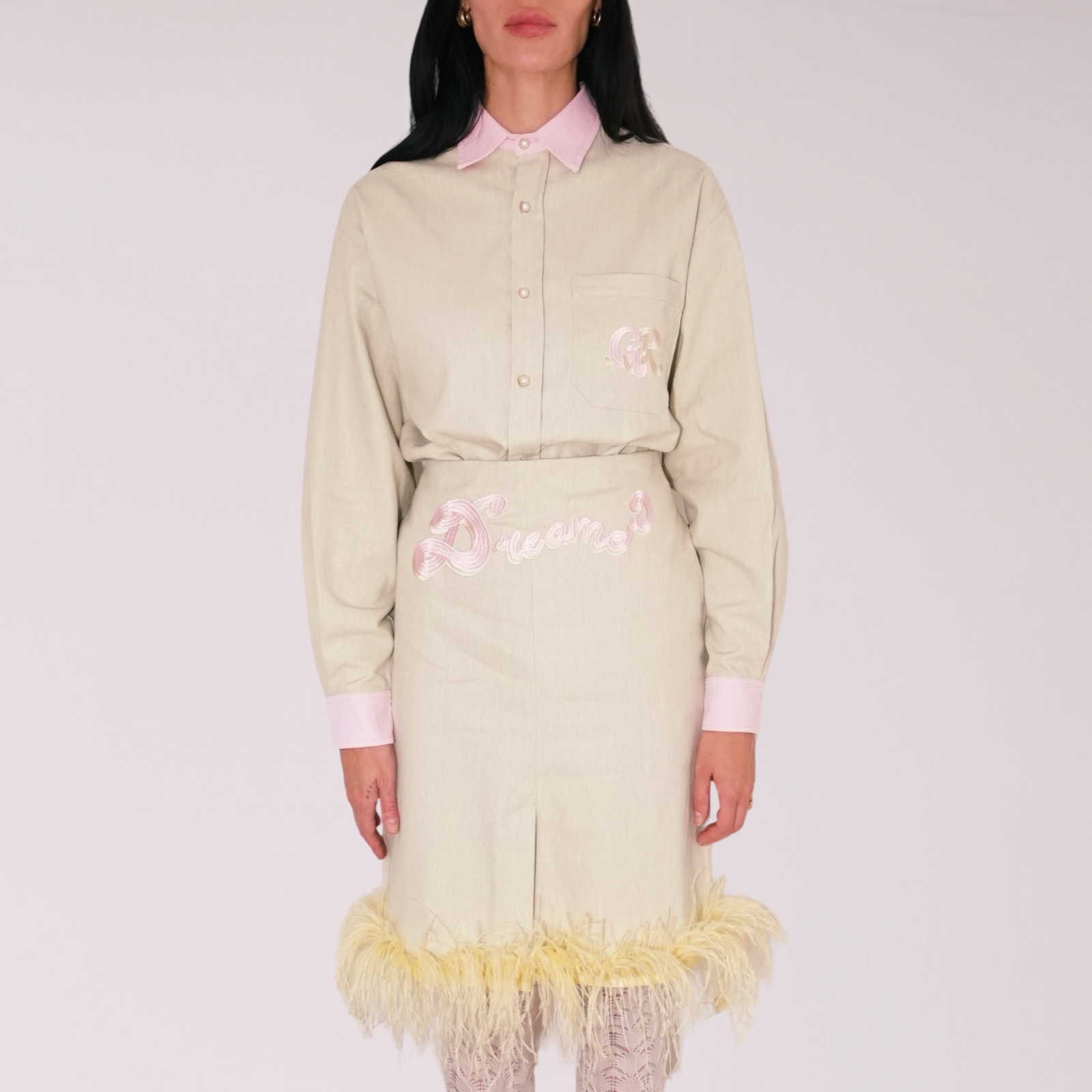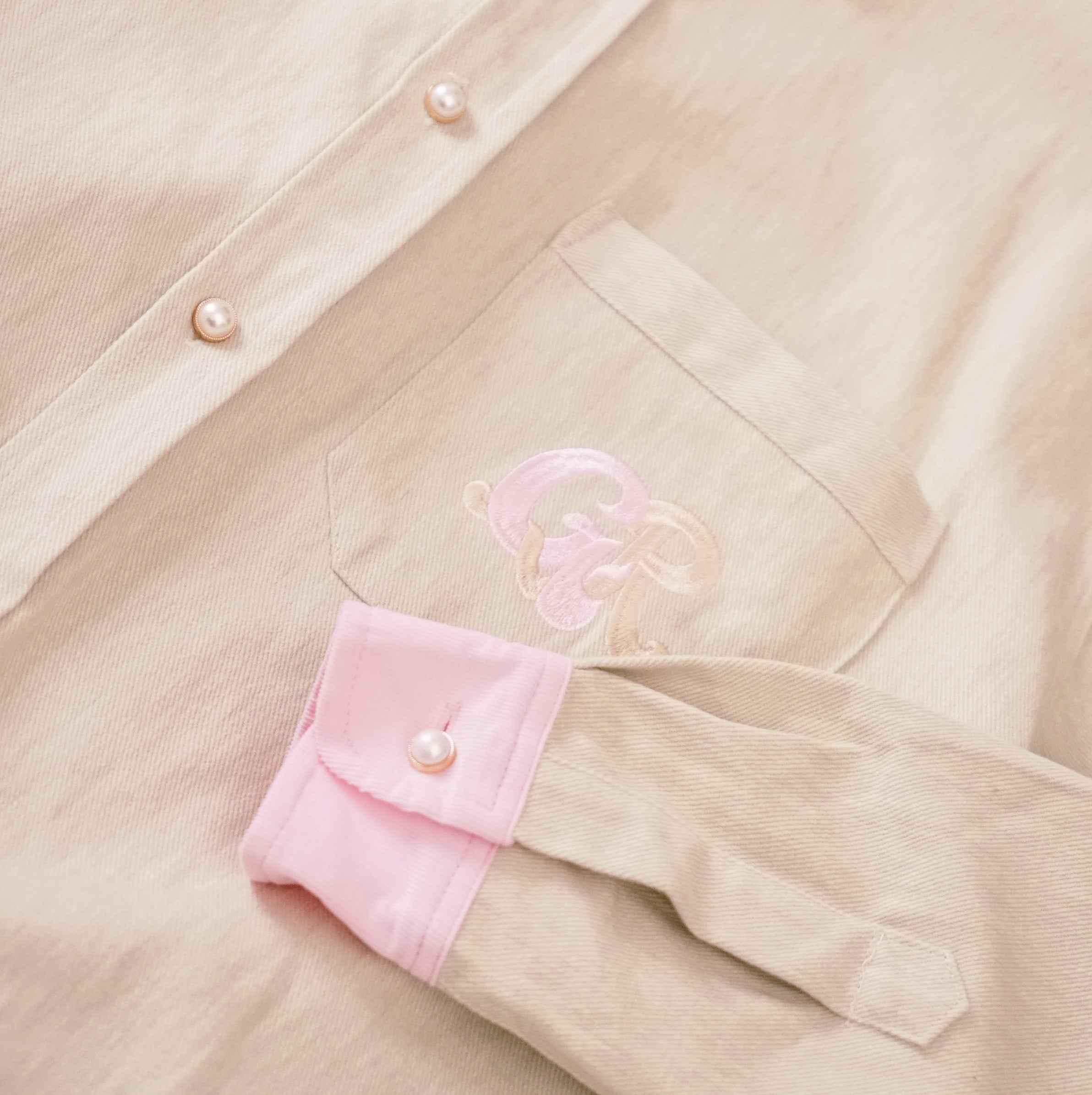 100% thick denim with faux pearl buttons, light green colour, pink corduroy collar, embroidered front pocket, horse print on the back, model is 1.78 height & wears size M