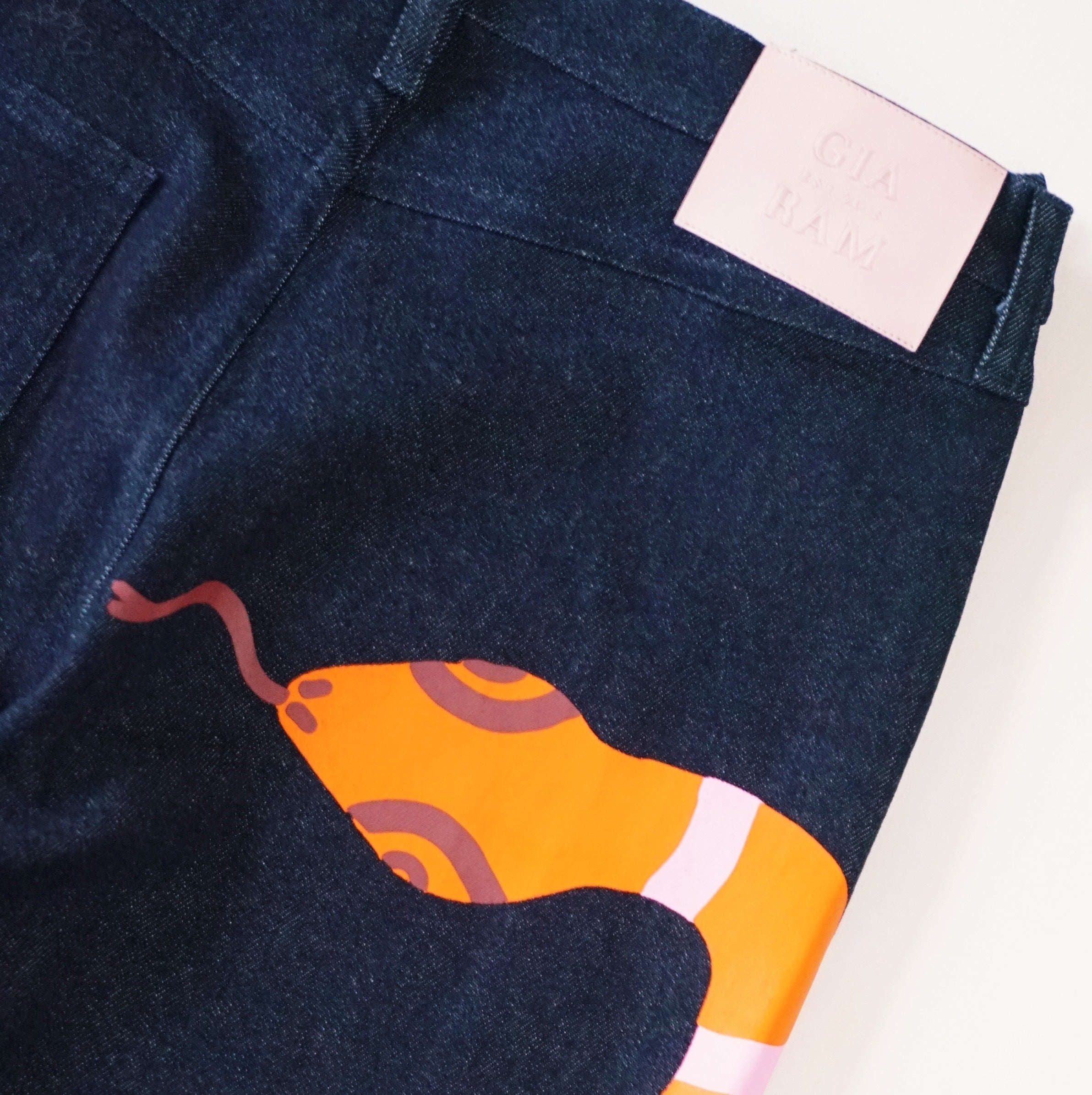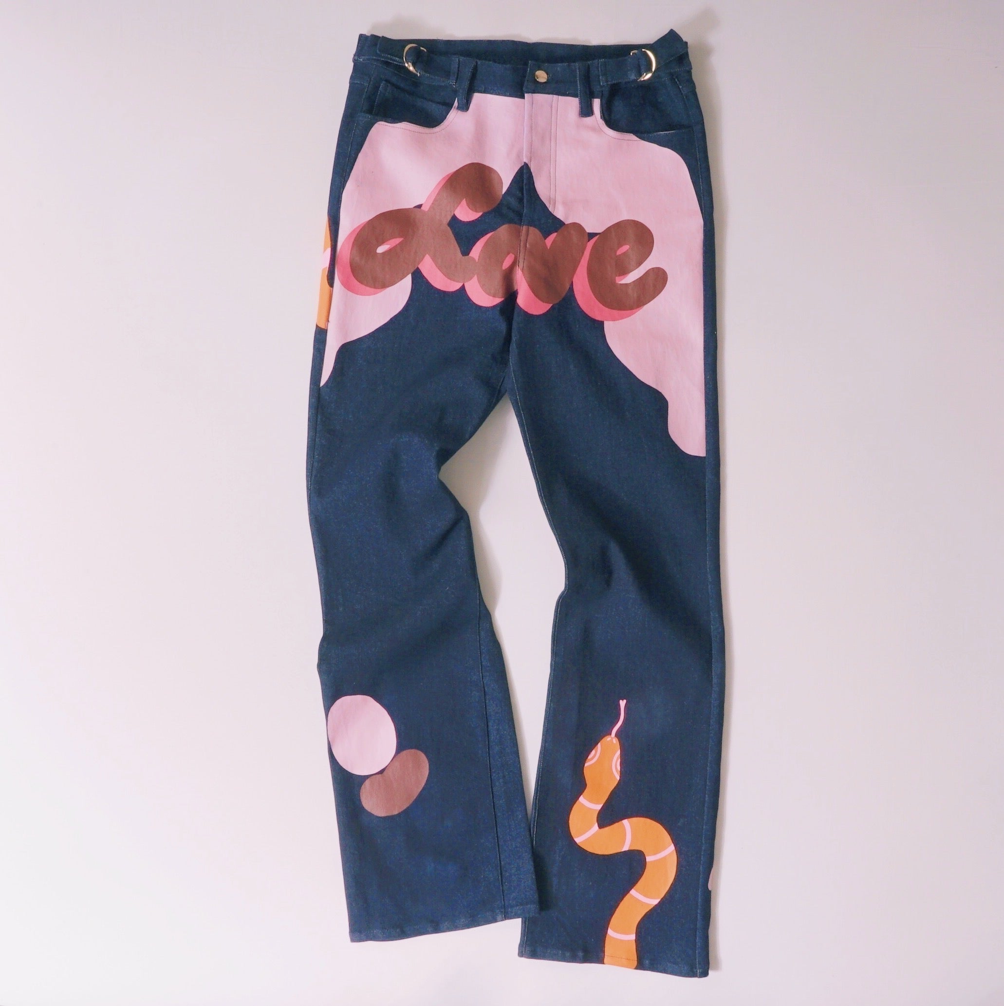 "Love" jeans is extra soft denim like stretchy cotton fabric made to fit all shapes and feel comfortable, high waisted with adjustable stripes on sides, made a bit longer so you can wear it 2 ways with folded bottoms or regular unfolded, art print all over